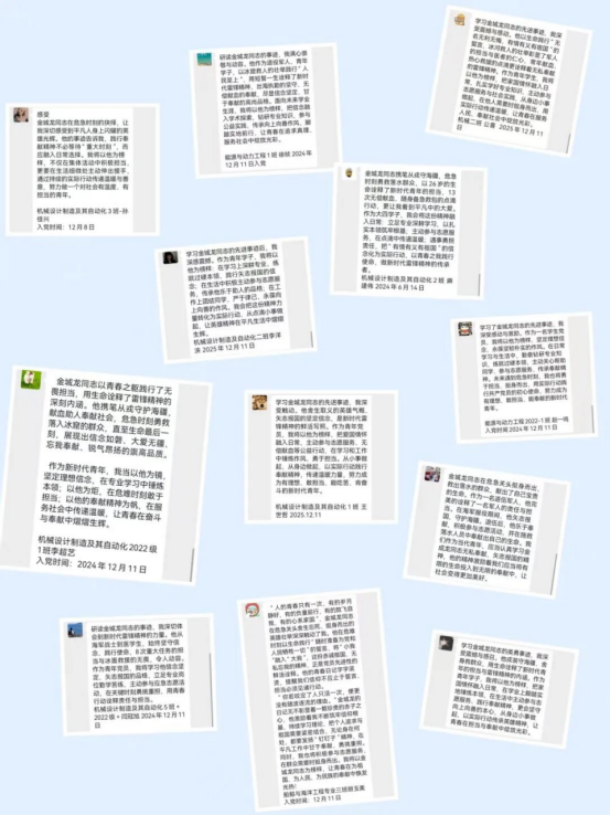 观看仪式结束后,师生们结合自身学习、工作与专业实际,畅谈学习感悟,共话使命担当,纷纷表示要以金城龙同志为榜样,把英雄精神转化为奋进前行的实际行动。