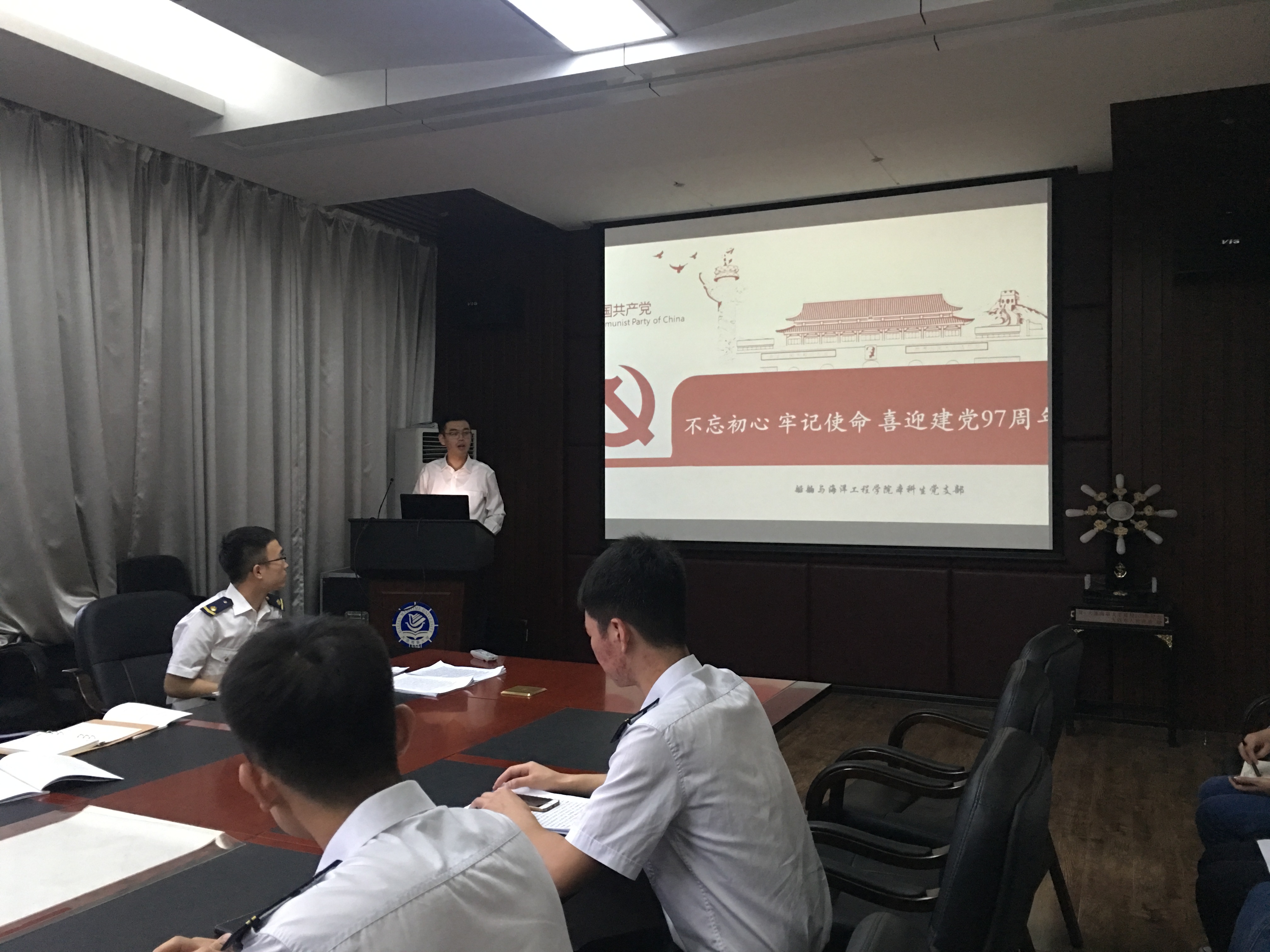 为迎接建党97周年,使支部成员亮明身份,牢记使命。7月1日上午,船舶与海洋工程学院本科生党支部在机电楼431会议室举办“追寻历史忆光辉九十七载,牢记使命青春建功新时代”主题党日活动,支部全体党员参加此次活动。