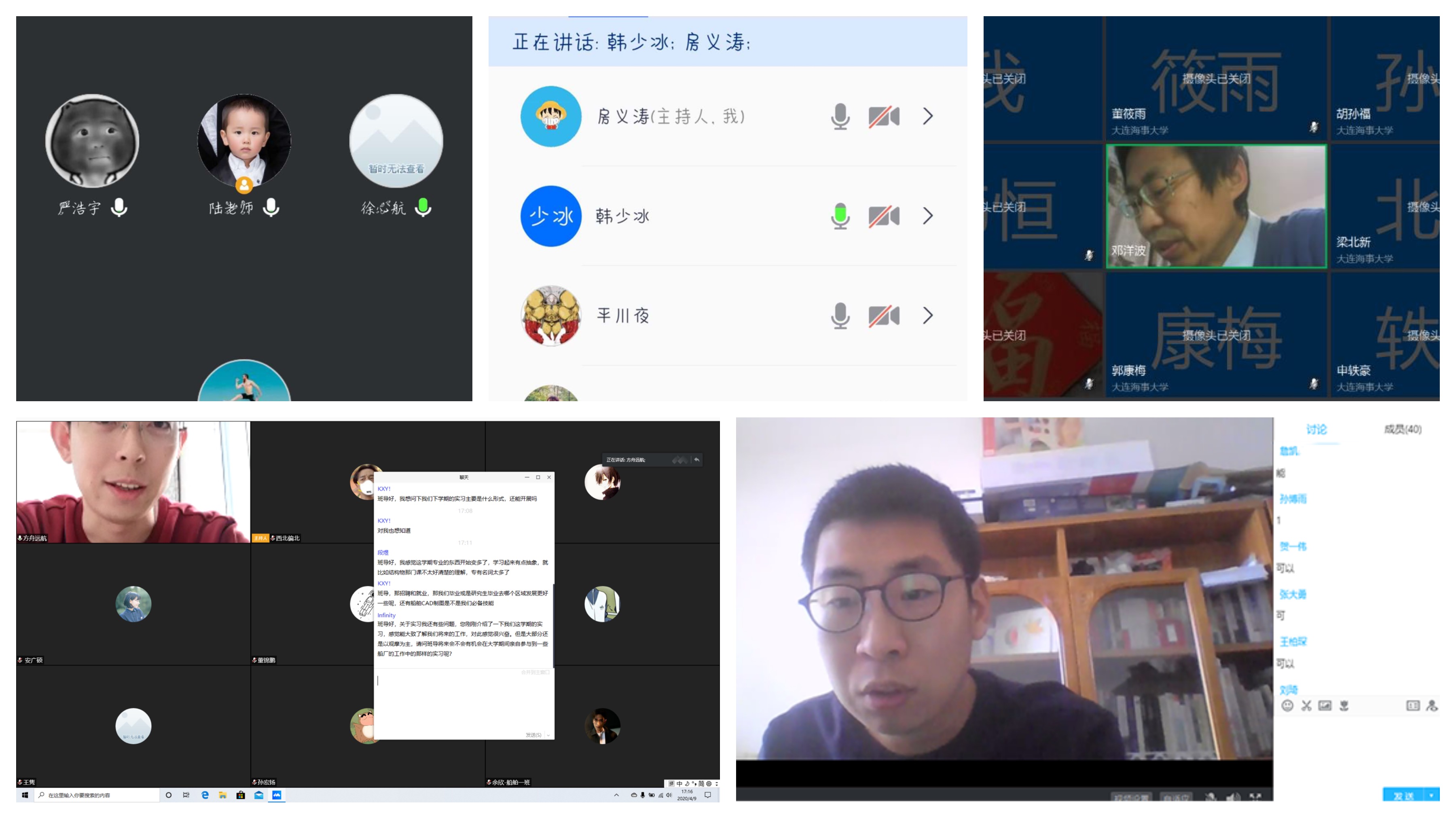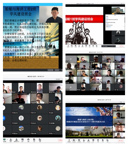 疫情防控期间,为全面了解学生“空中课堂”的学习情况和思想动态,助力线上教学工作的有序开展。4月上旬,船舶与海洋工程学院全体班导师与所带班级学生依托腾讯会议、腾讯课堂,钉钉、微信群等线上平台,齐聚屏幕前,互动交流,开展线上主题班会。
