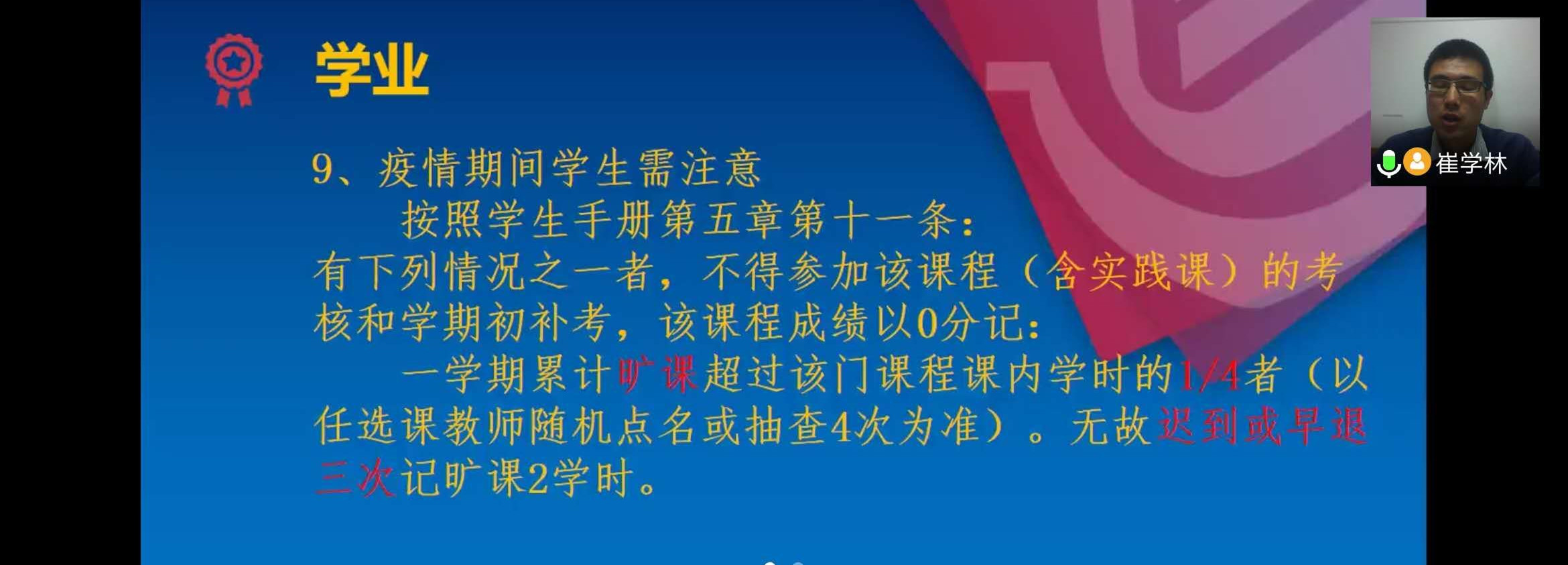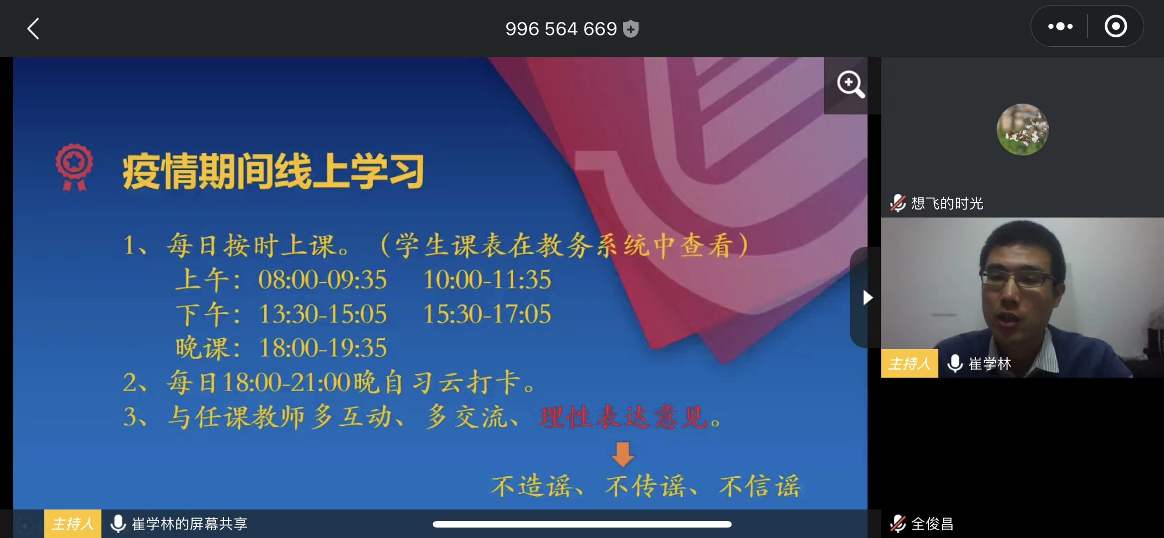 会前,崔学林于线上征集整理学生家长关于学校政策、疫情开学安排及学生安全等相关问题。会议首先,崔学林向各位家长介绍了学院专业概况、中队总体情况及中队半年来的成就与荣誉。接下来,崔学林就学生学业、日常事务管理以及疫情期间注意事项三方面向家长进行了讲解,其中重点介绍了学生自入学以来的成绩情况,并向各位家长介绍了绩点的计算方法、学生成绩的查询方法及学业对保研、毕业的影响以及疫情期间学生在做好自身防范的同时,要坚持不造谣、不传谣、不信谣。此外,崔学林强调了当前疫情期间学生不仅要注重线上学习、自主学习,更要注重自身的身体健康,要坚持锻炼、保持良好作息习惯。最后,崔学林根据往年的学院专业就业情况并结合自身经验与家长们分析探讨了各专业学生的就业情况,并就会前征集的家长问题做出了相关解答与提醒。
