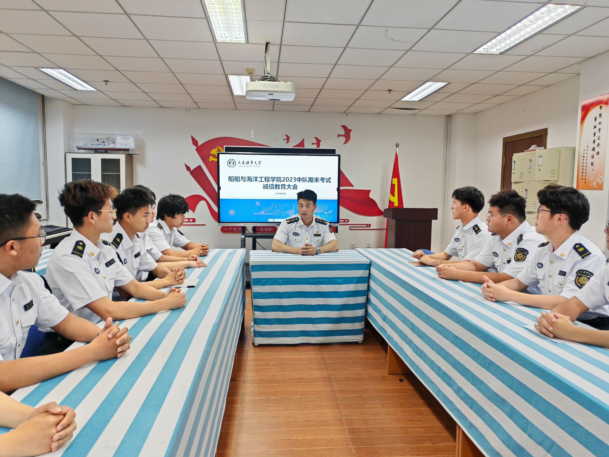 各中队指导员向同学们传达了学校党委学生工作部、教务处发布的加强学生考风考纪的相关通知及期末考试的重要提醒通知,同时又带领同学们一同学习了《大连海事大学学生违纪处分办法》、《大连海事大学课程考核工作管理规定》以及《大连海事大学学士学位授予工作实施办法》;各中队提醒同学们要按时考试,不要贪图一时的便利而违反诚信原则,并向同学们明确说明考试作弊的严重后果,提醒同学们不要心存侥幸,一定要杜绝作弊事件发生。