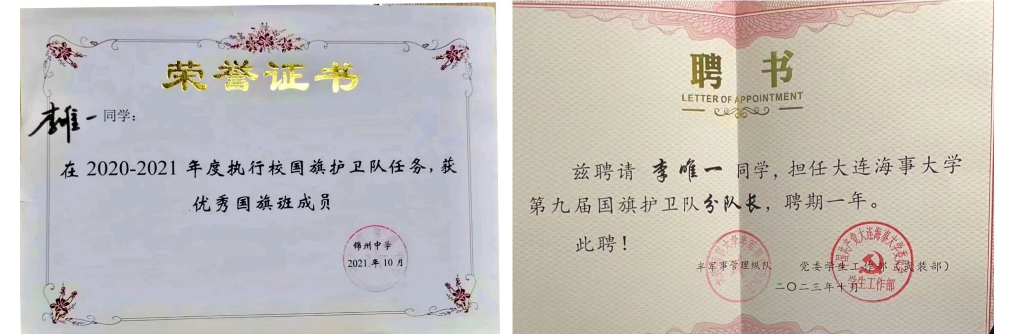 当谈起他为什么选择加入国旗护卫队,他说:从小他就有一颗为国护旗的心,早在初高时他就是一名护旗手;出于对国旗的热爱、对护卫国旗的情怀,进入大学后他第一时间报名加入国旗护卫队,更值得一提的是他和他从幼儿园、小学、中学一直到大学都同校的好朋友田旻丰一起考进海事大学,并一起加入了国旗护卫队,昔日的好同学好伙伴变成了今朝的好兄弟、好战友。