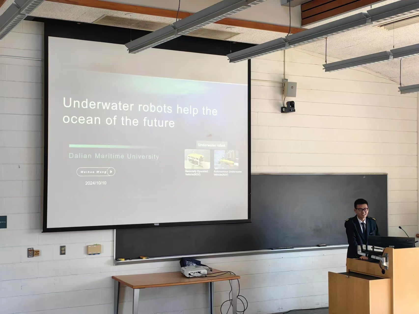 王伟浩作为中国代表在学生论坛环节发表了题为Underwater Robots Help the Ocean of the Future的演讲。他主要介绍了水下机器人技术如何在保护海洋生态、提高水下作业效率以及应对海洋环境变化等方面发挥重要作用,王伟浩的发言赢得了与会代表的热烈掌声,充分展现了我院学生过硬的专业素养与良好的精神风貌。