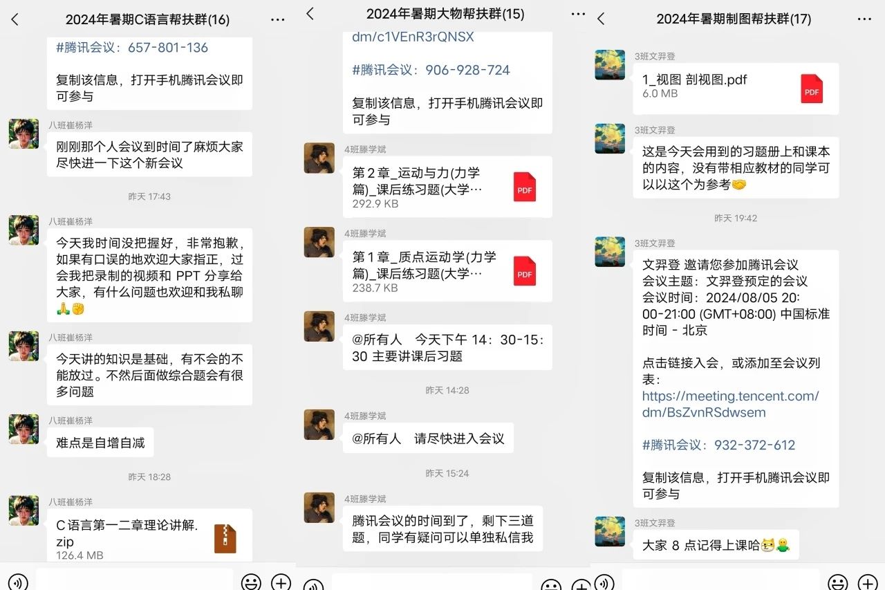 在暑期辅导期间,这些“朋辈导师”利用腾讯会议等在线平台,针对科目的重点和难点进行了深入的教学和答疑,有效地提升了同学们对相关科目知识的理解和掌握,帮助他们更好地完成了暑期学习任务。