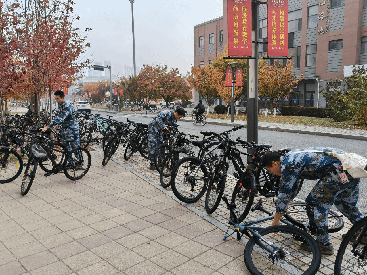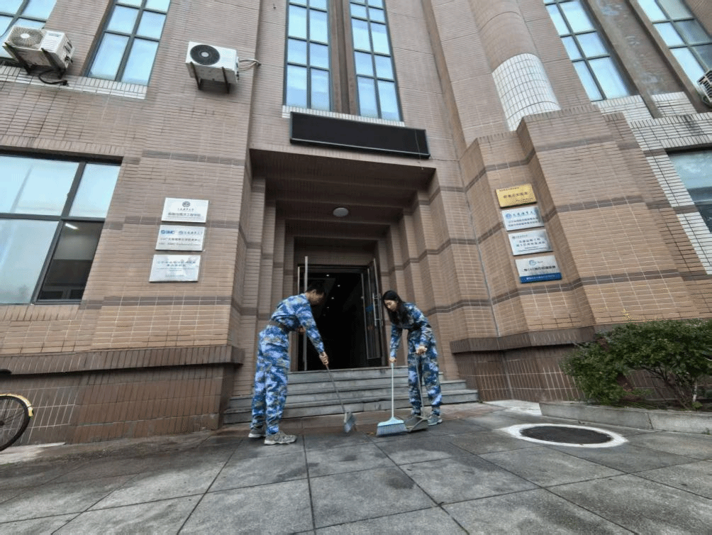 在公寓周边,同学们认真擦洗护栏标识。此外,同学们还自发组织分工将散乱停放的自行车归位整齐,使校园环境更加规范有序。整个过程组织高效,展现了船海学子良好的精神风貌与团队协作能力。