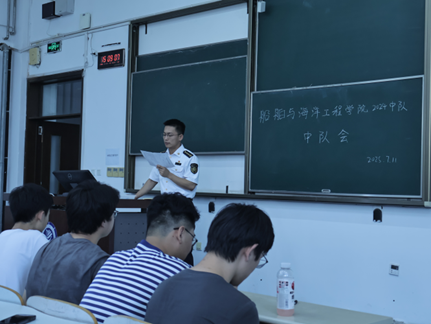 为统筹部署暑期各项工作,筑牢学子安全防线,凝聚新学期奋进力量,7月11日,船舶与海洋工程学院2024中队召开暑假前专题中队会。本次会议由中队指导员李腾主持,中队全体学生参加,全面总结学期成效、明确暑期要求,为学期工作画上圆满句号,为暑期生活筑牢坚实根基。